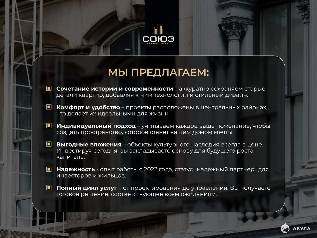 Надежность - работаем с 2022 года и зарекомендовали себя как надежный партнер для инвесторов и жильцов.