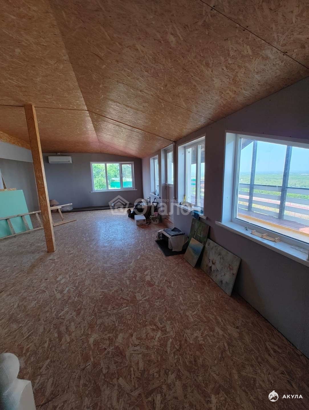 Мансарда - 120 м2 (холл-50м2 и четыре комнаты для гостей). Большой балкон. Здание на фундаменте и с армопоясом.
