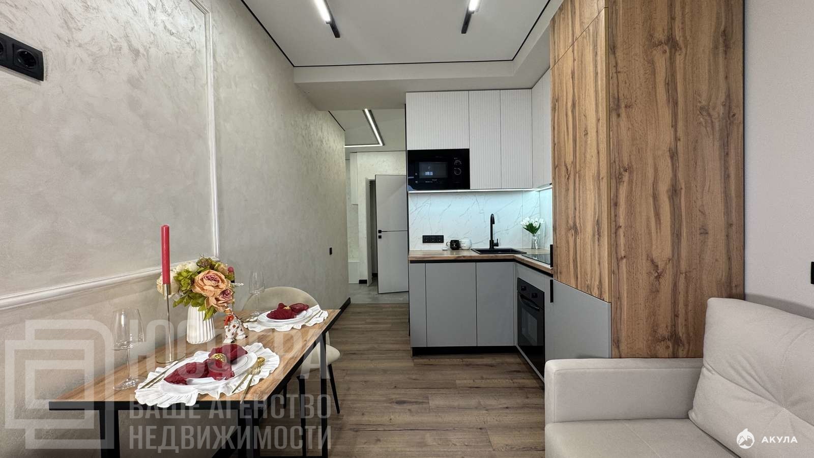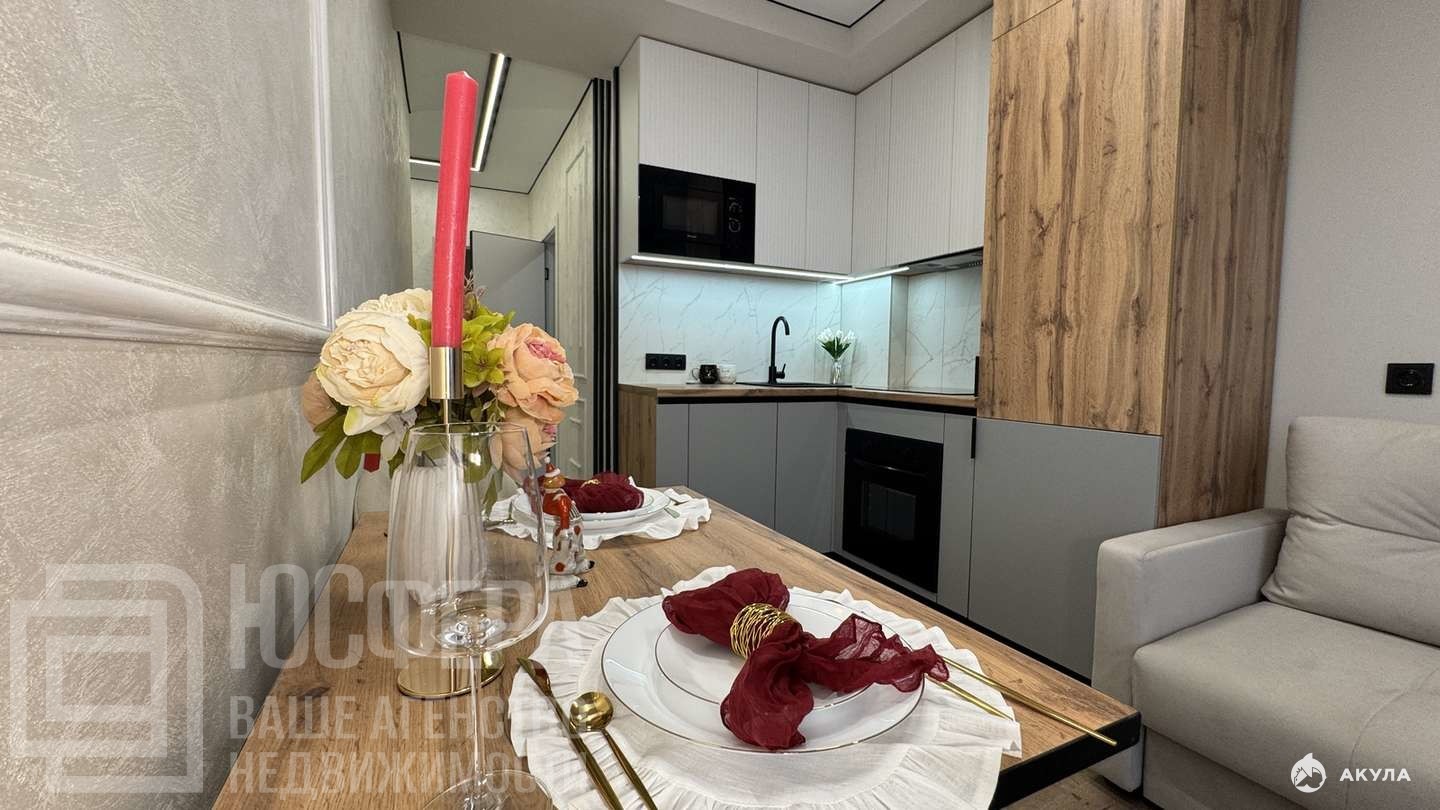 Эксклюзивный ремонт с декоративной штукатуркой, встроенная техника — холодильник No Frost, духовой шкаф, посудомоечная машина — и вся мебель, выполненная на заказ, остаётся новому владельцу.