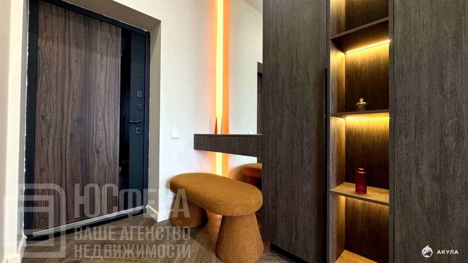 При входе — зеркало с подсветкой и «парящий» шкаф в едином стиле