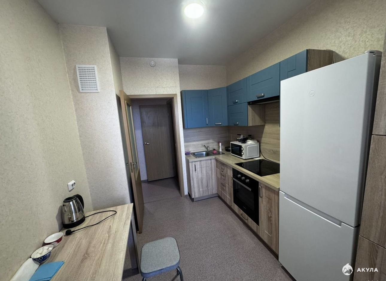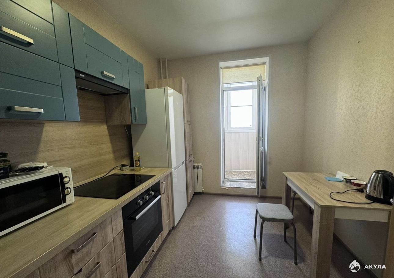 Просторная кухня площадью 10 кв.м оборудована современной техникой, включая холодильник и микроволновую печь. Из окон открывается вид на тихий двор, где расположена детская и спортивная площадки. В квартире совмещенный санузел, что добавляет удобства.