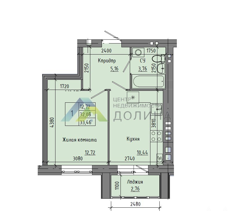 Жилая комната площадью 12, 7 кв.м., кухня площадью более 10 кв.м. с выходом на остекленную лоджию;
