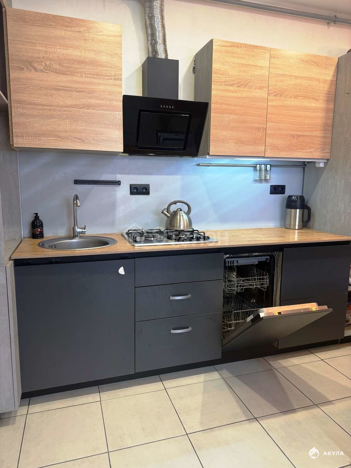 - Современное оснащение кухни: полный комплект мебели и техники (включая варочную поверхность, духовку, вытяжку и посудомоечную машину)