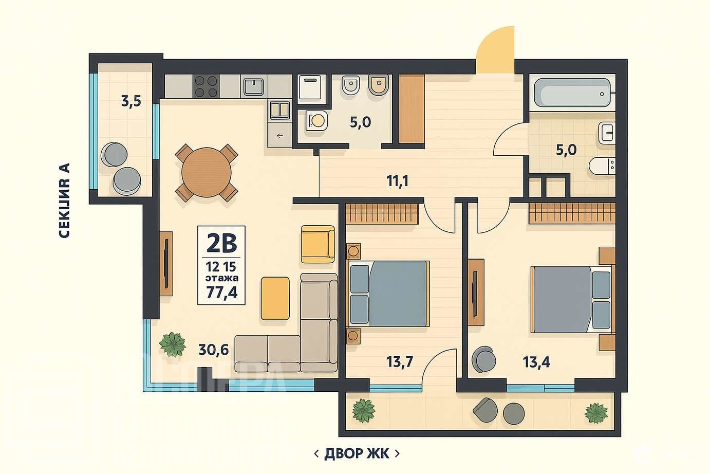 — 2 изолированные комнаты (13, 4 + 13, 7 кв.м) с выходом на лоджию;
