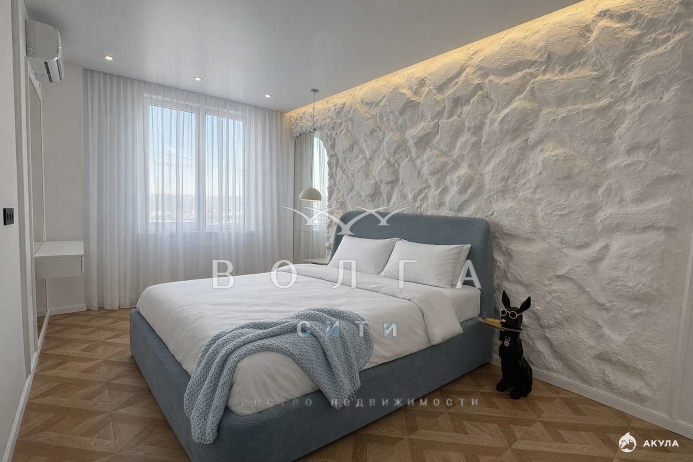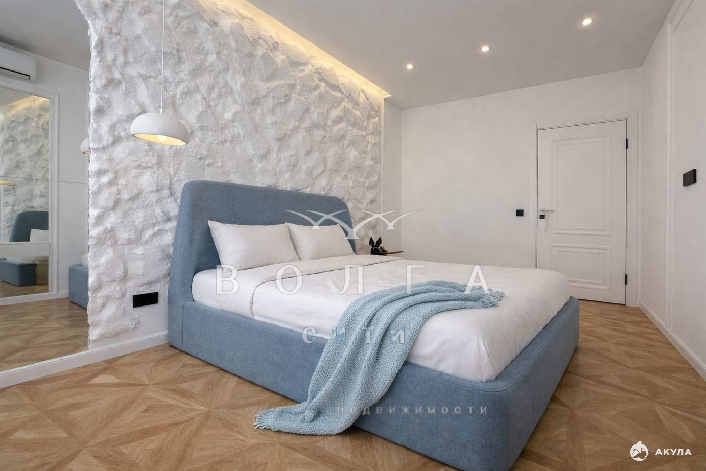 Двуспальная кровать, акцентная стена «белая скала», встроенные зеркала, потолочные бра