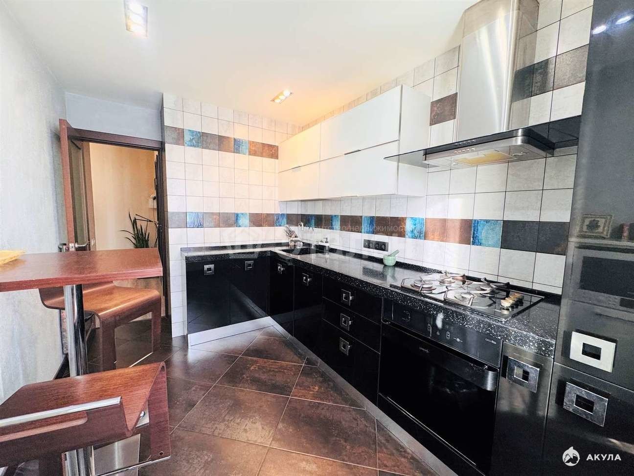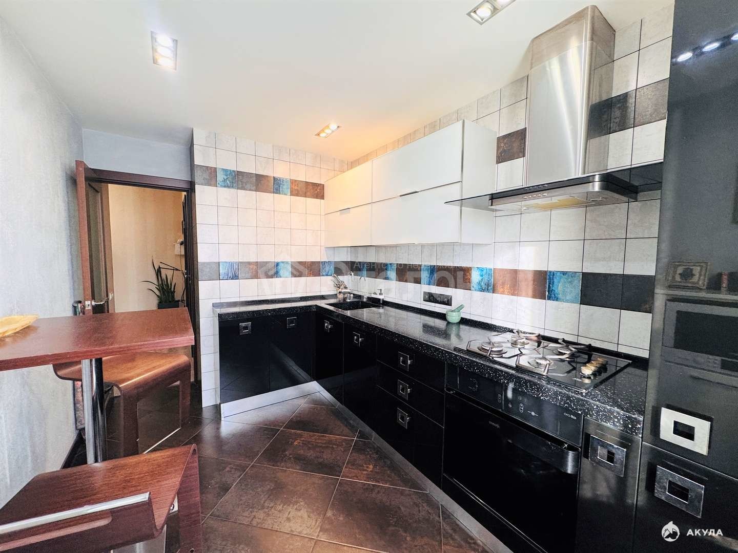 отделка кухни - на полу итальянский керамогранит, фартук итальянская плитка.кухонный гарнитур фирмы Аран, встроенная техника(духовой шкаф, варочная поверхность, вытяжка, холодильник, микроволновка, посудомоечная машина).