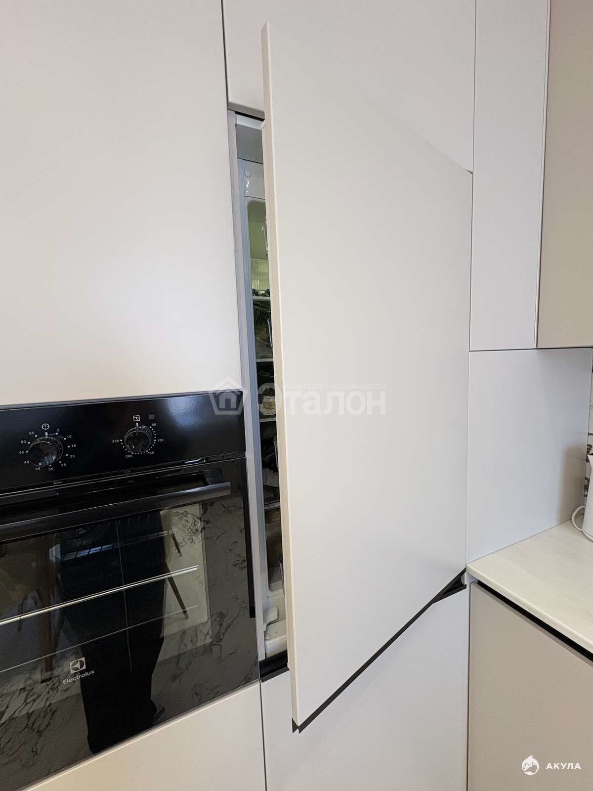Встроенный кухонный гарнитур со всей необходимой техникой: посудомоечная машина, холодильник, стирально-сушильная машина.