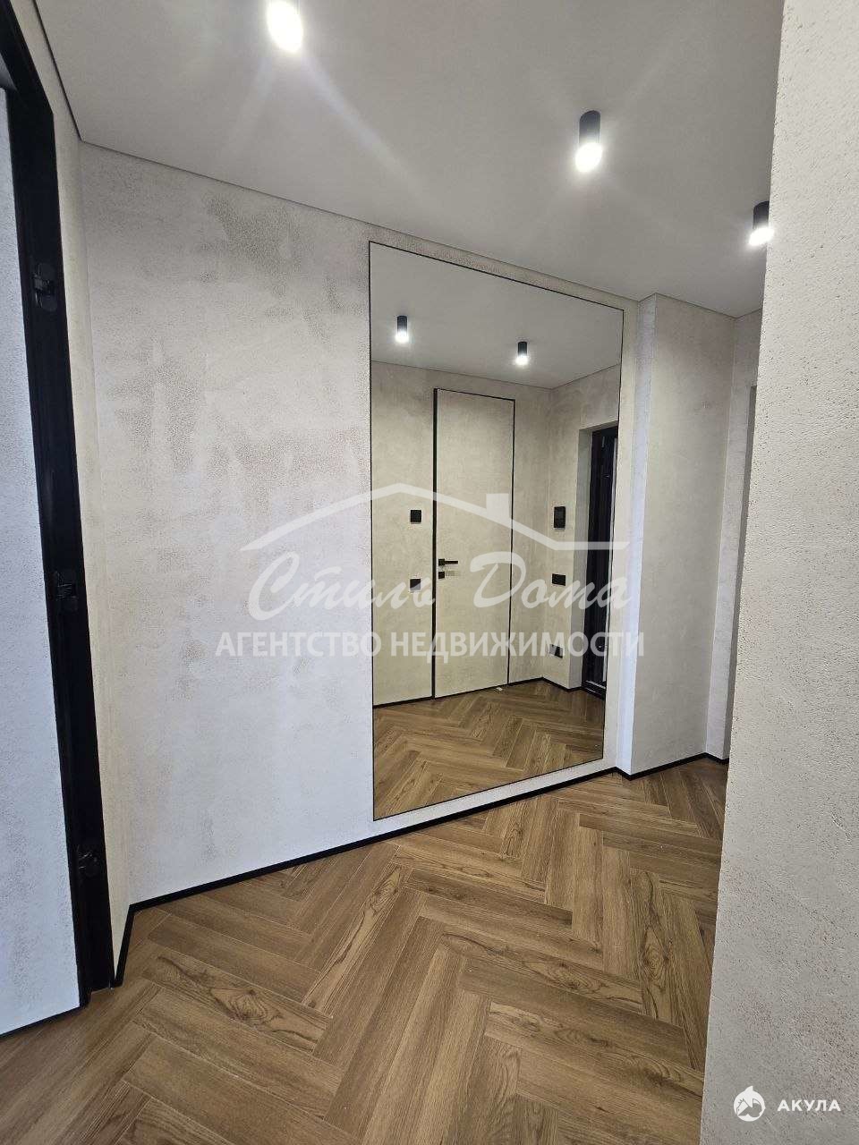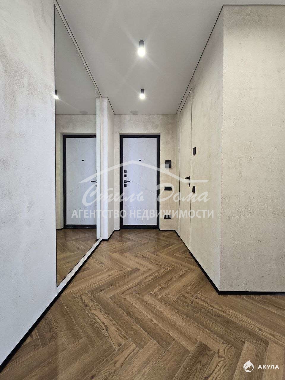 — элегантная прихожая с большим зеркалом в полный рост и дверями скрытого монтажа под потолок.