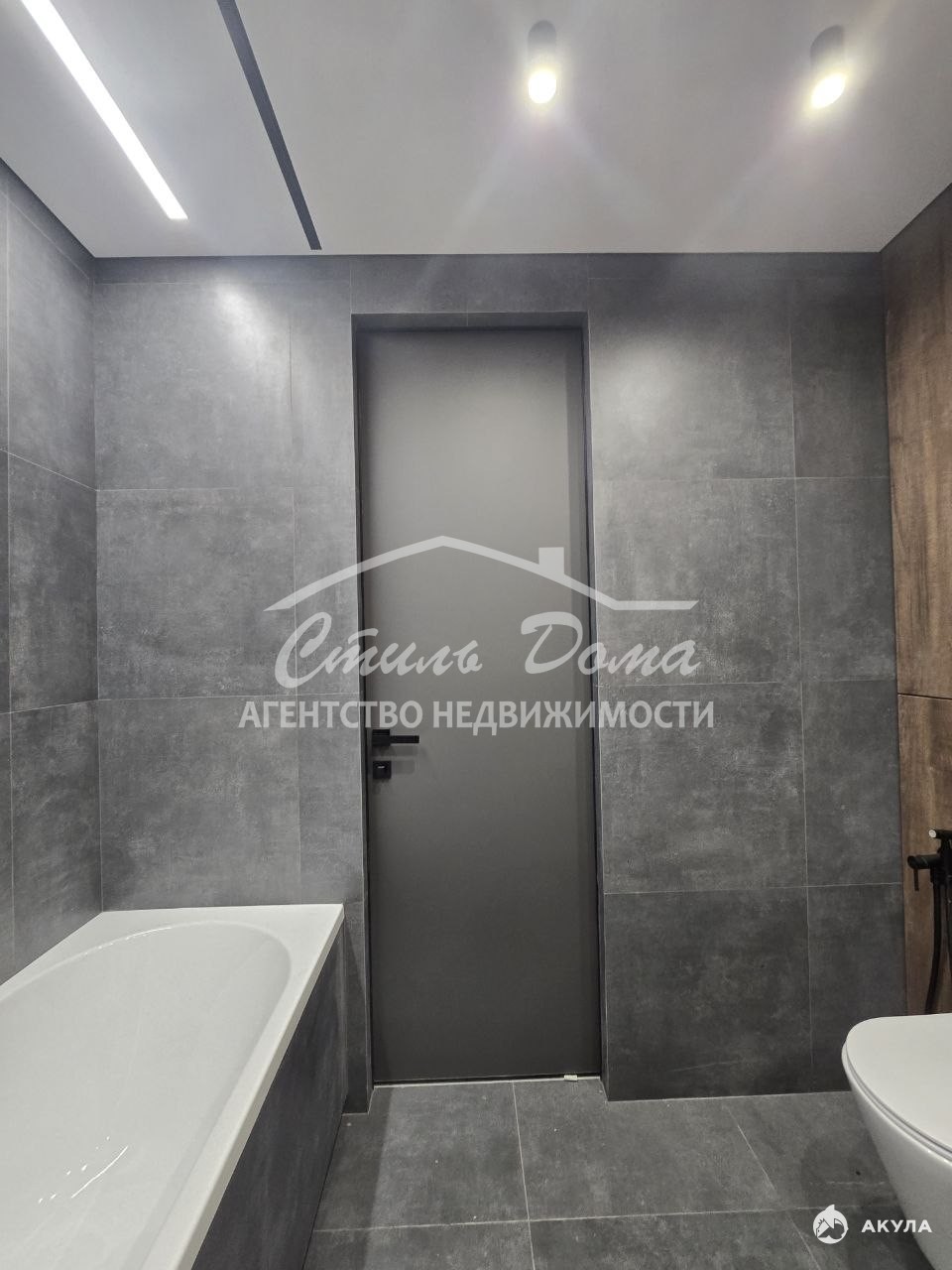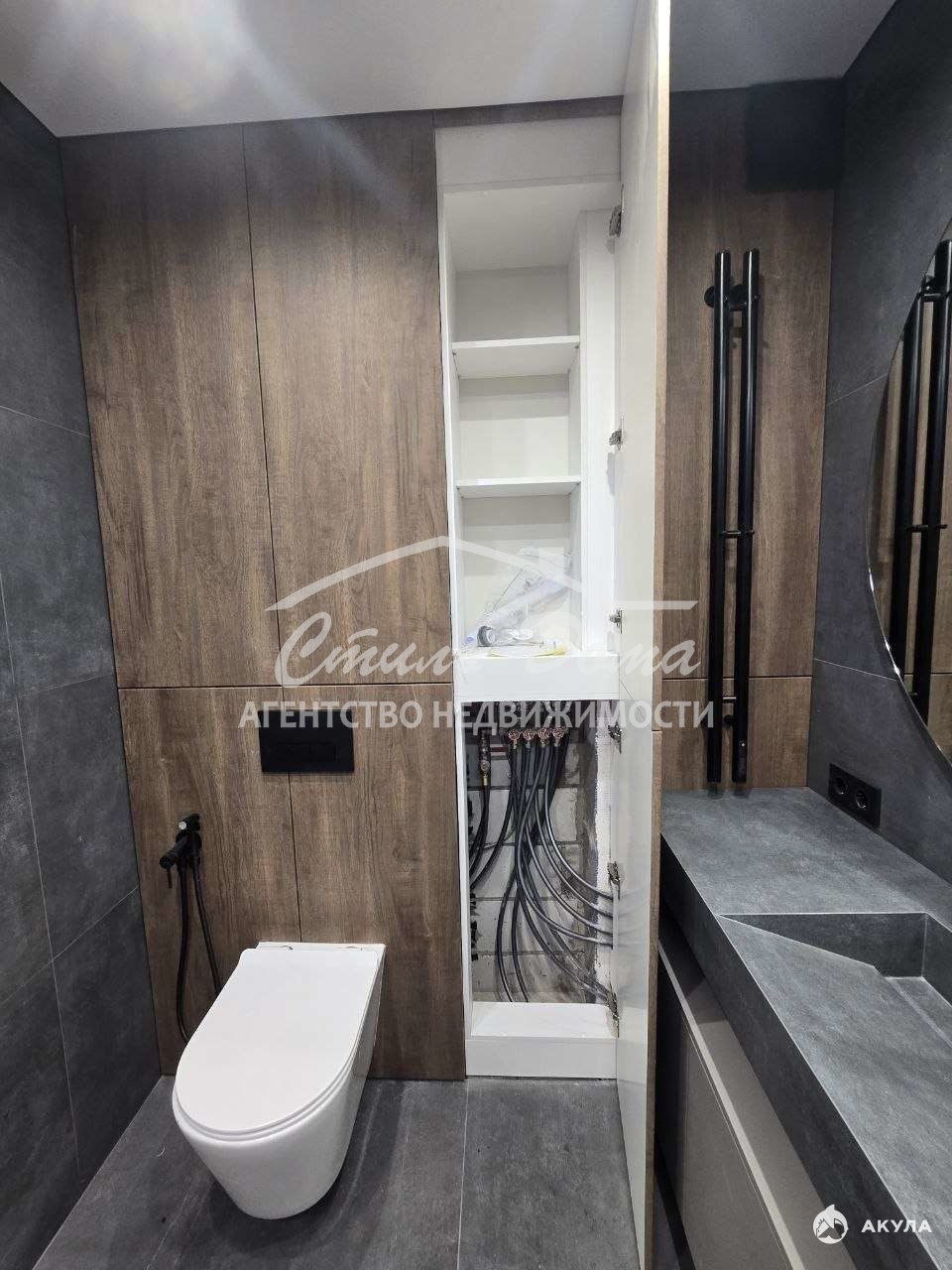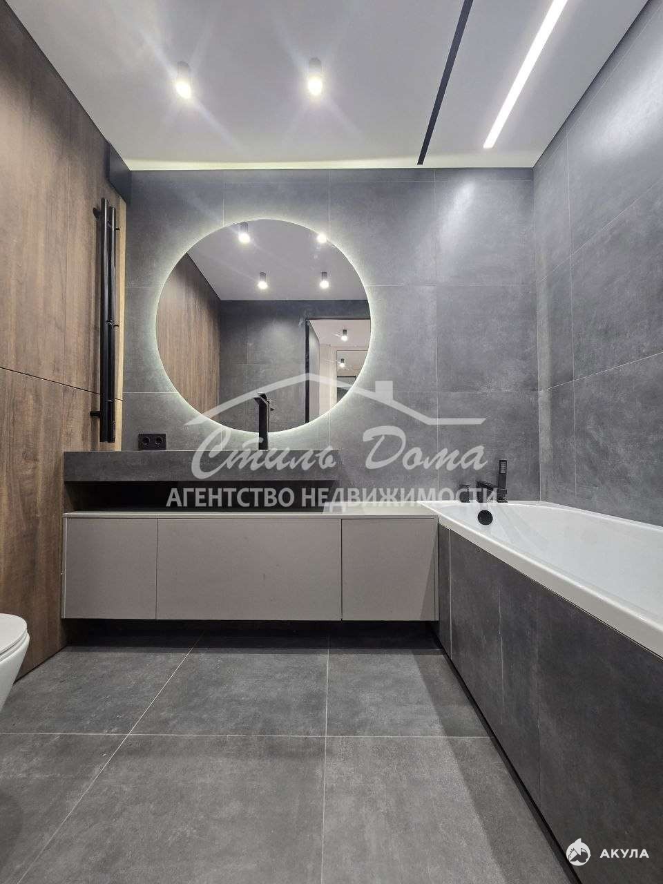 — дизайнерская ванная комната с крупноформатной плиткой, подвесной и скрытой системой хранения и эффектной подсветкой с несколькими сценариями освещения. Также имеются тёплые полы, которыми можно управлять с помощью Алисы и др. Систем умного дома