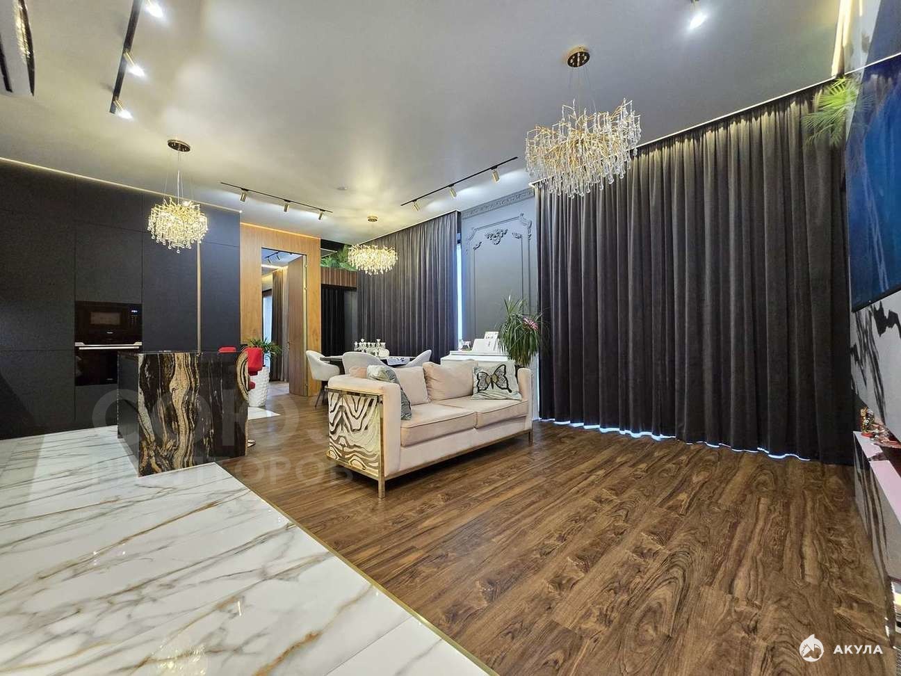 В квартире реализована система умного дома, к которой подключены климатическая техника, тёплый пол, шторы, телевизоры, освещение, аудиосистема и голосовое управление.
